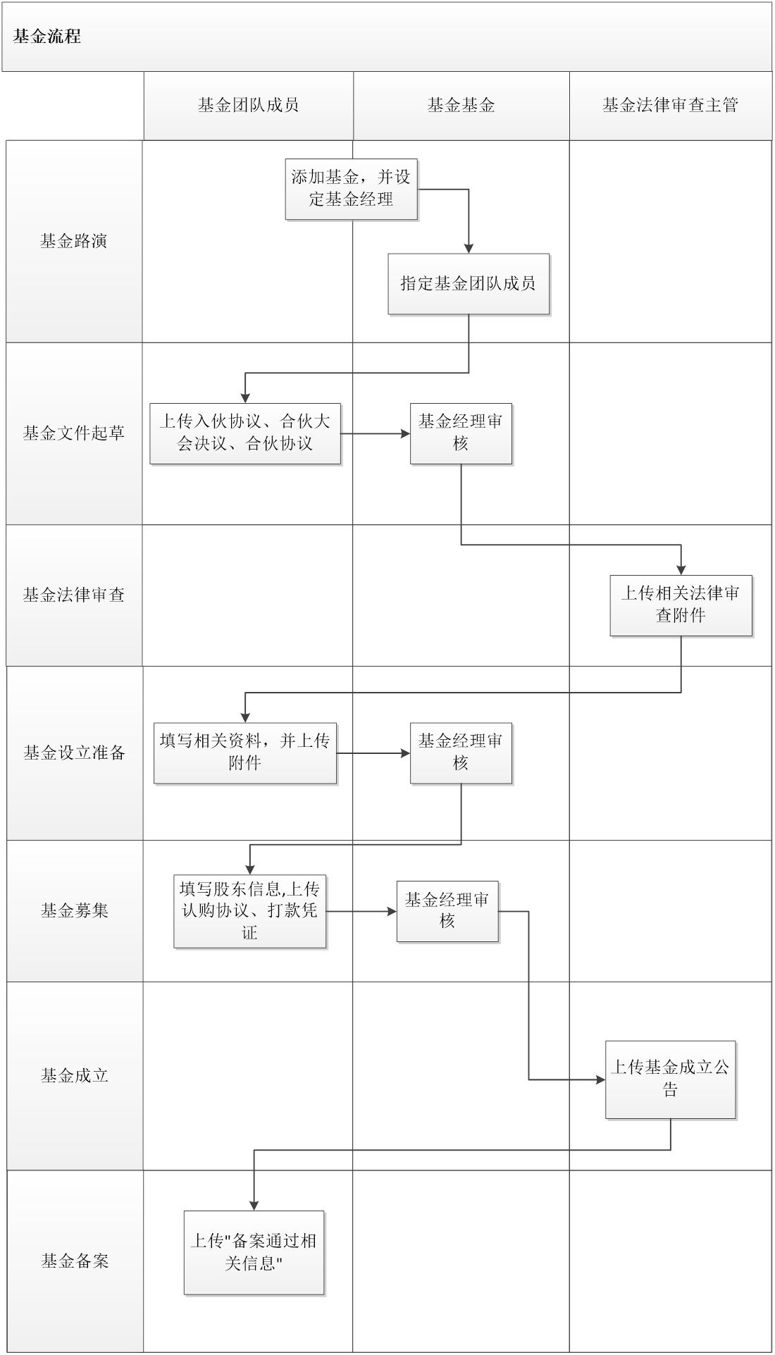 基金成立流程:基金路演、基金文件起草、基金法律审查、基金设立准备、基金募集、基金成立、基金备案、基金清算、基金终止。