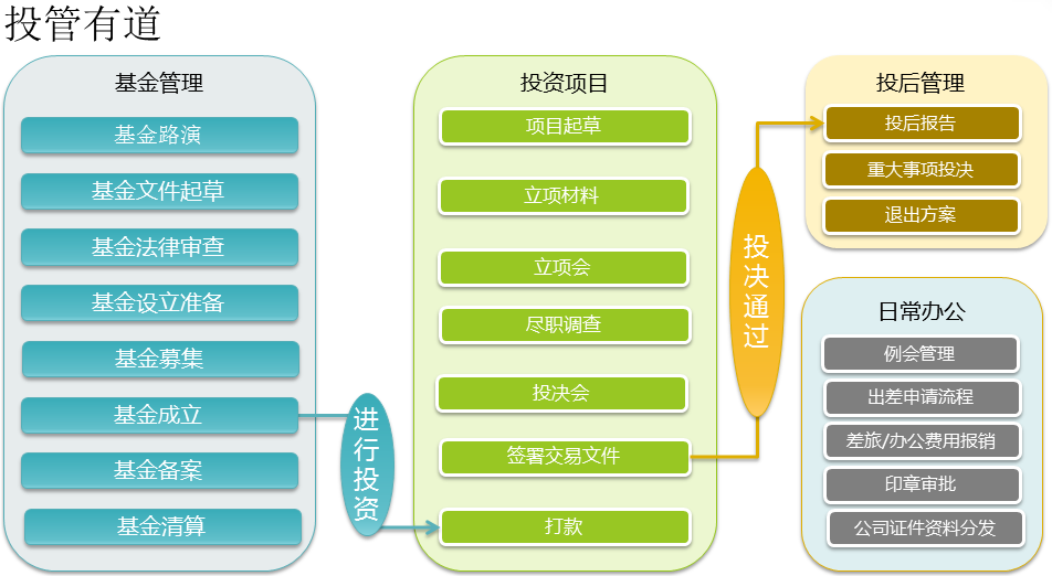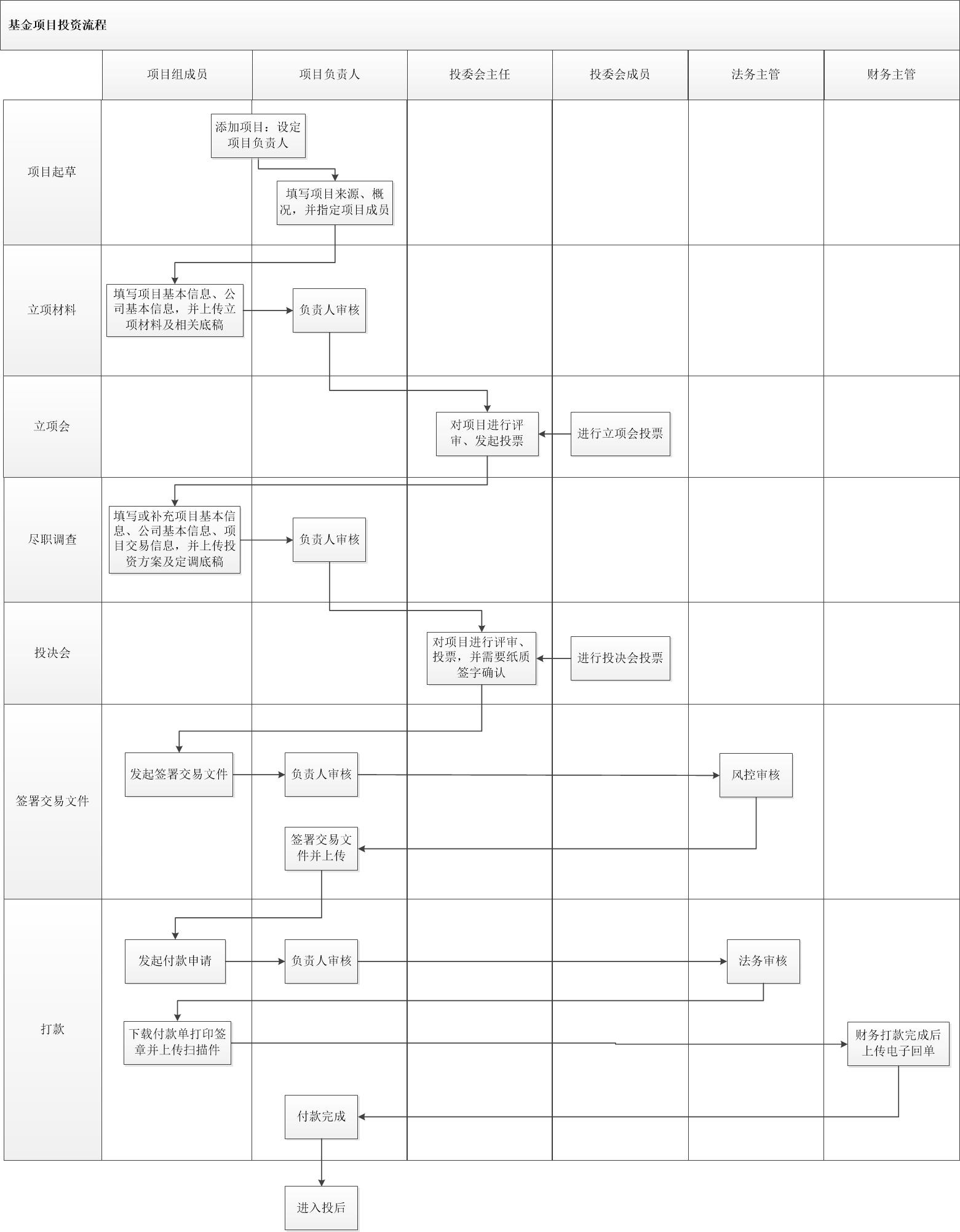 主流程:项目起草、立项材料、立项会、尽职调查、投决会、签署交易文件、打款、投后。